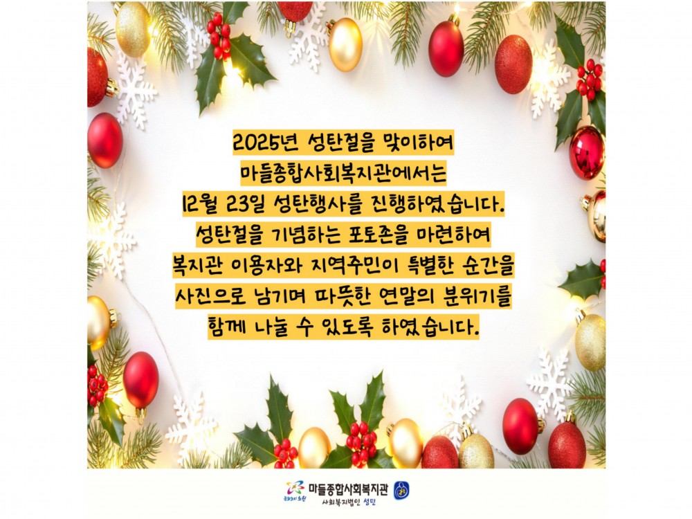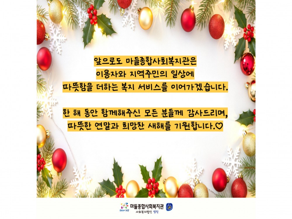 2025년 성탄 나눔 행사 페이지 정보 작성자 서비스팀 작성일25-12-29 19:29 조회145회 댓글0건 관련링크 이전글 다음글 목록 본문 #크리스마스 #붕세권 #연말* 이 디자인은 미리캔버스에서 작업되었습니다.(https://www.miricanvas.com) 댓글목록 등록된 댓글이 없습니다. 이전글 다음글 목록