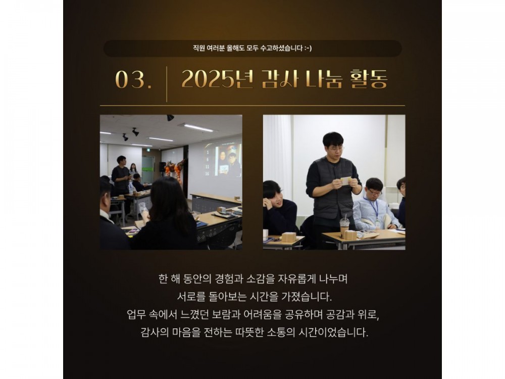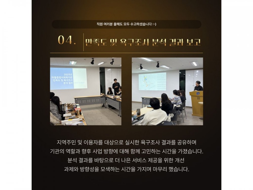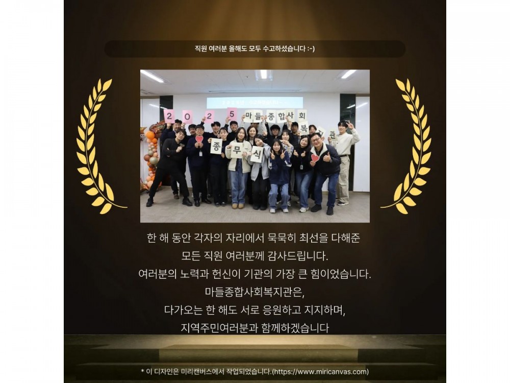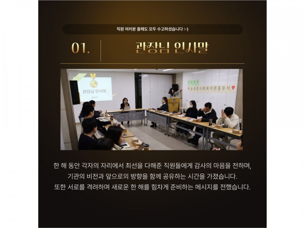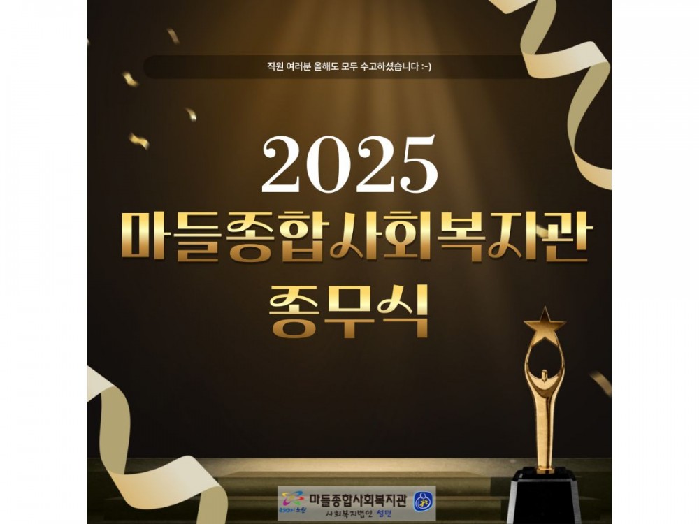 2025년 마들종합사회복지관 종무식 페이지 정보 작성자 경영지원팀 작성일25-12-31 17:10 조회146회 댓글0건 관련링크 이전글 다음글 목록 본문 댓글목록 등록된 댓글이 없습니다. 이전글 다음글 목록