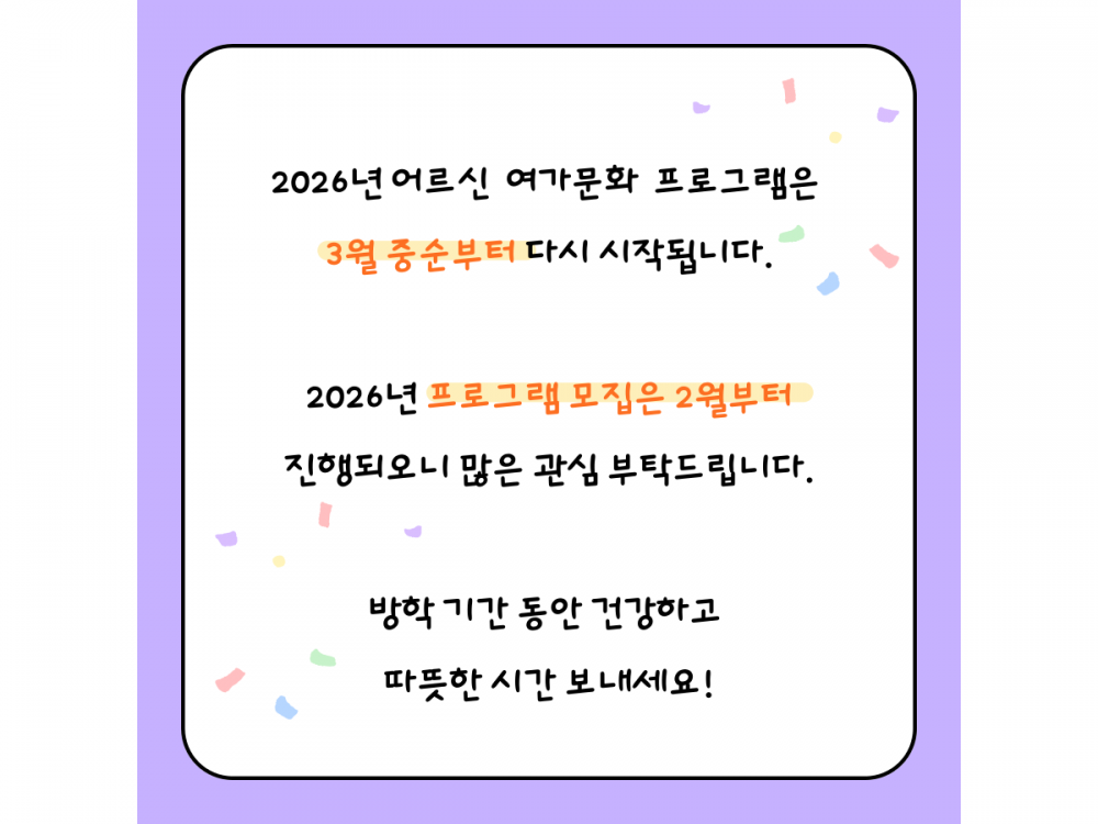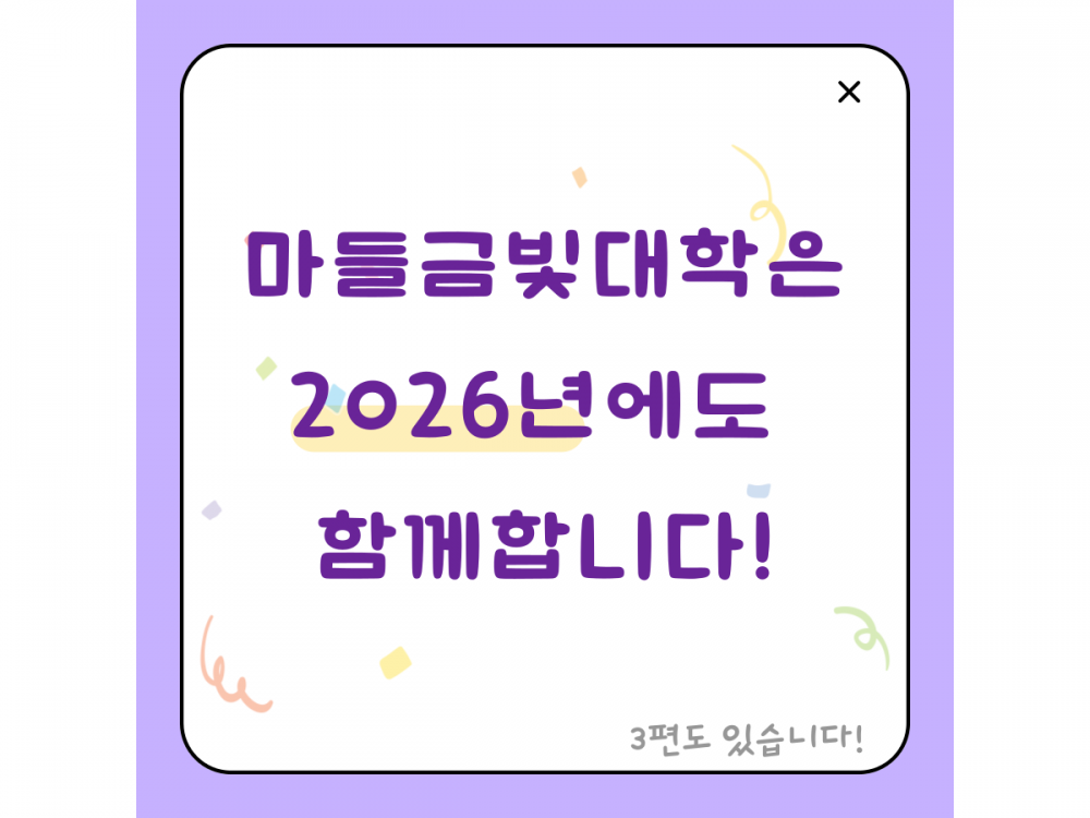 마들금빛대학 문화여가프로그램 하이라이트 페이지 정보 작성자 서비스팀 작성일25-12-23 15:36 조회204회 댓글0건 관련링크 이전글 다음글 목록 본문 #크리스마스 #붕세권 #연말* 이 디자인은 미리캔버스에서 작업되었습니다.(https://www.miricanvas.com) 댓글목록 등록된 댓글이 없습니다. 이전글 다음글 목록