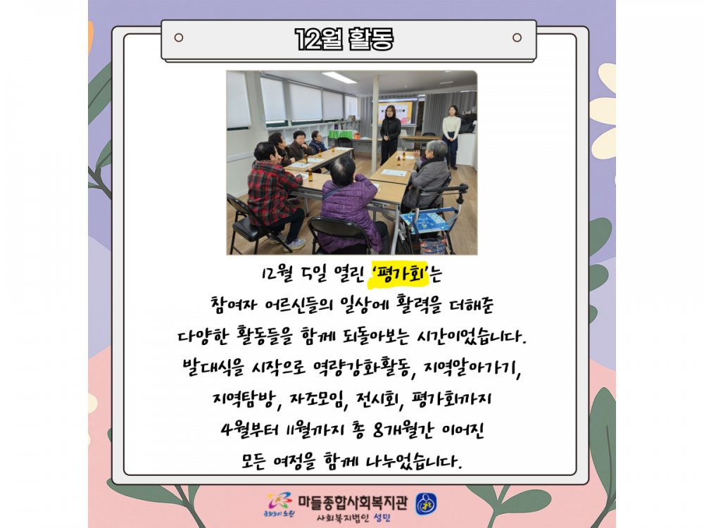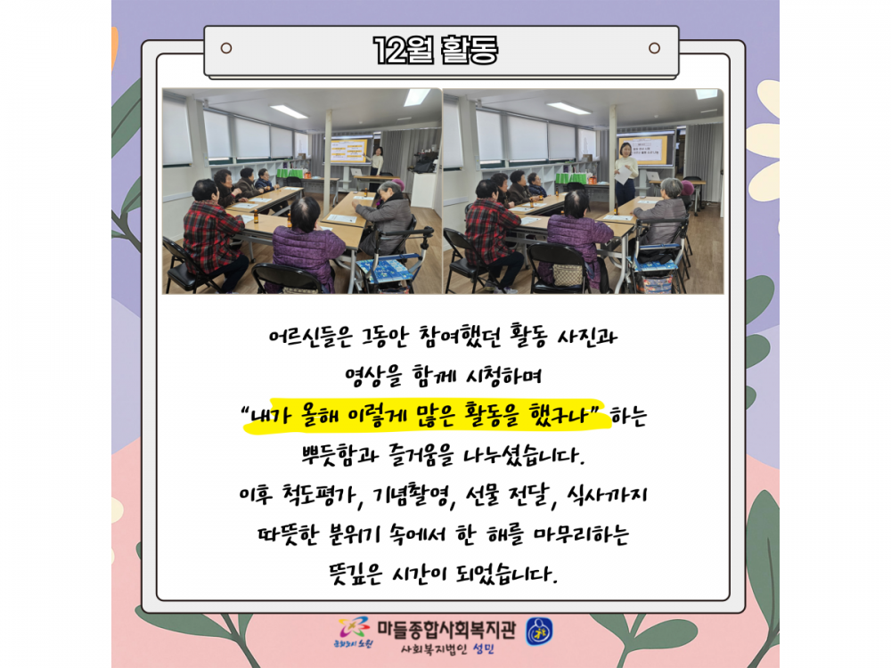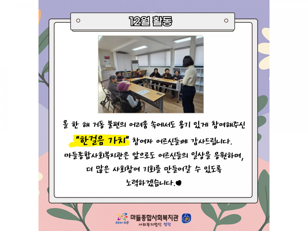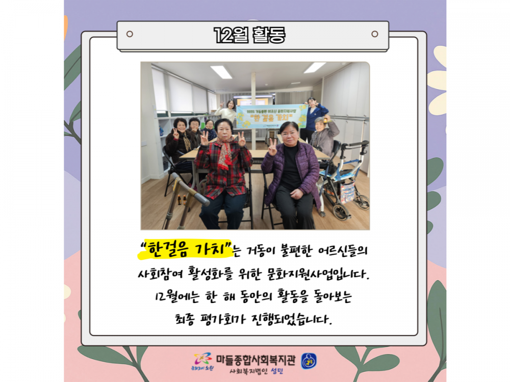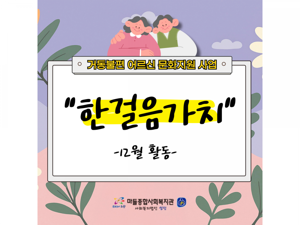 거동불편어르신 문화지원사업 '한걸음가치' 12월 활동 페이지 정보 작성자 서비스팀 작성일25-12-11 15:08 조회323회 댓글0건 관련링크 이전글 다음글 목록 본문 #크리스마스 #붕세권 #연말* 이 디자인은 미리캔버스에서 작업되었습니다.(https://www.miricanvas.com) 댓글목록 등록된 댓글이 없습니다. 이전글 다음글 목록