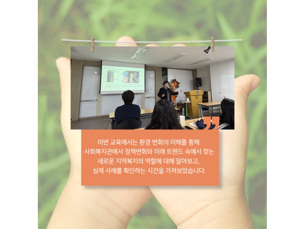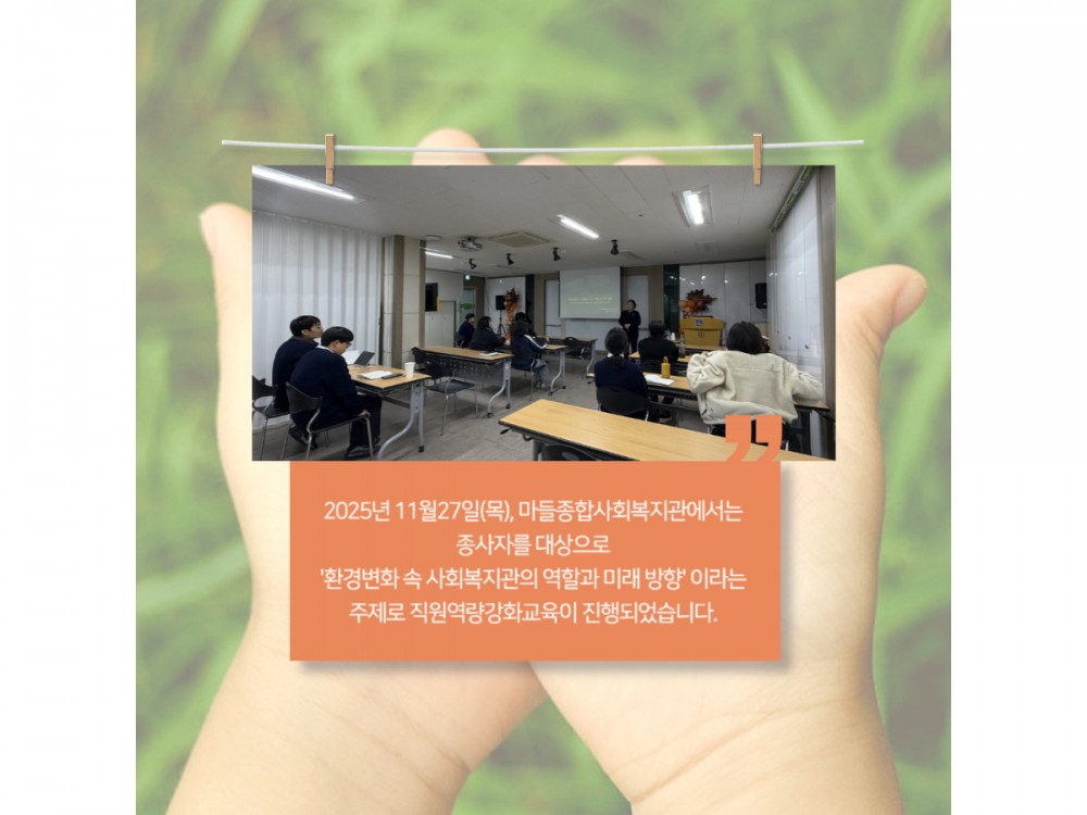 직원역량강화교육 (사회복지 동향 및 법체계 교육) 페이지 정보 작성자 시설운영팀 작성일25-11-27 19:57 조회487회 댓글0건 관련링크 이전글 다음글 목록 본문 * 이 디자인은 미리캔버스에서 작업되었습니다.(https://www.miricanvas.com)* 글꼴 출처 : https://bit.ly/4aRZ60P 댓글목록 등록된 댓글이 없습니다. 이전글 다음글 목록
