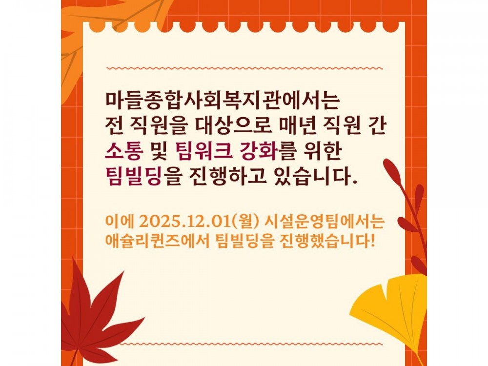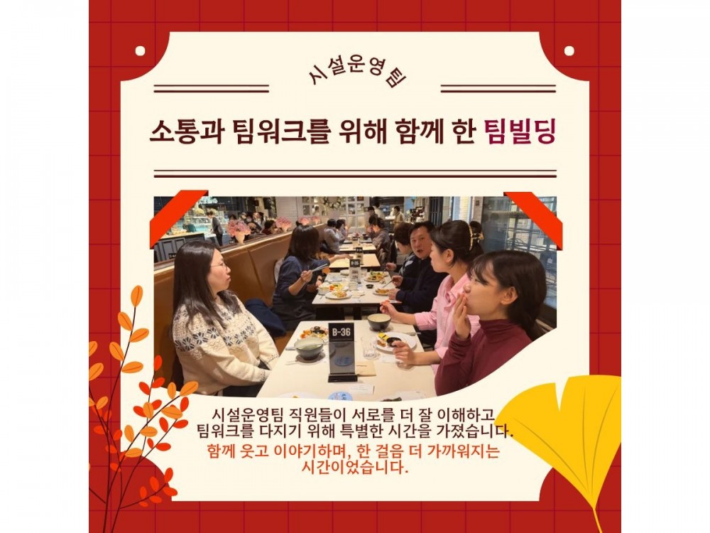 2025 시설운영팀 팀빌딩 페이지 정보 작성자 시설운영팀 작성일25-12-02 00:23 조회509회 댓글0건 관련링크 이전글 다음글 목록 본문 댓글목록 등록된 댓글이 없습니다. 이전글 다음글 목록