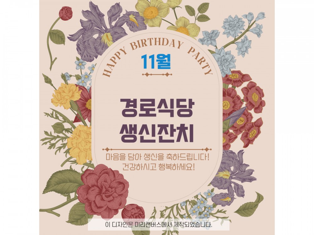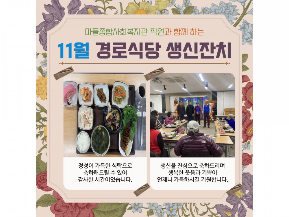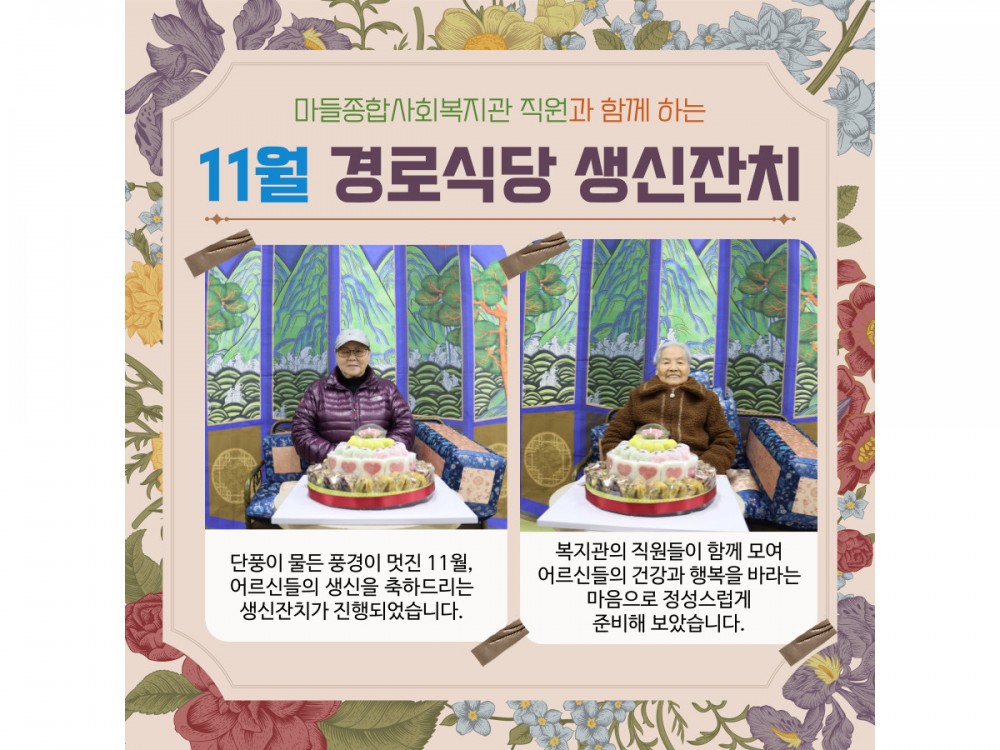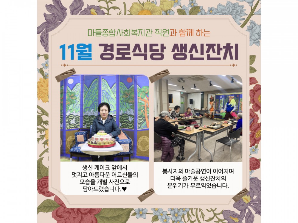 11월 경로식당 생신잔치 "함께라서 더 행복한 생일" 페이지 정보 작성자 서비스팀 작성일25-11-20 20:37 조회523회 댓글0건 관련링크 이전글 다음글 목록 본문 * 이 디자인은 미리캔버스에서 작업되었습니다.(https://www.miricanvas.com) 댓글목록 등록된 댓글이 없습니다. 이전글 다음글 목록
