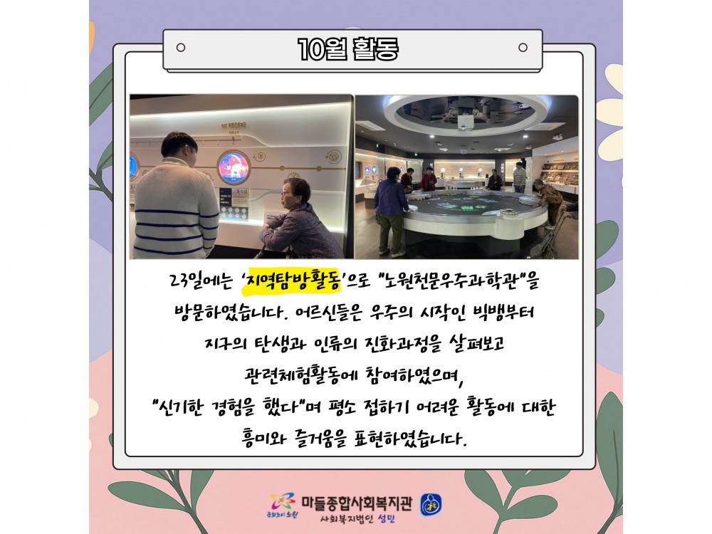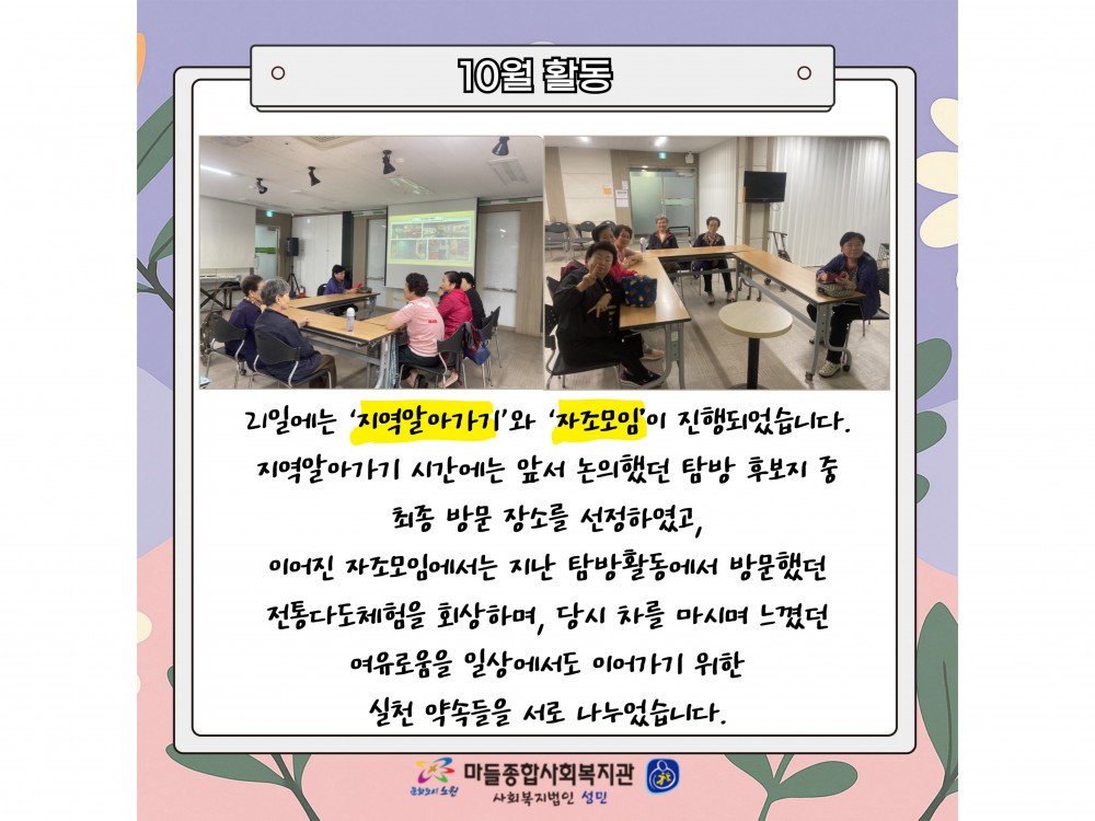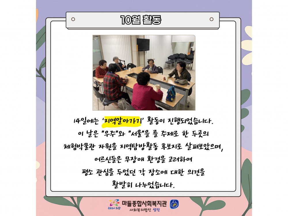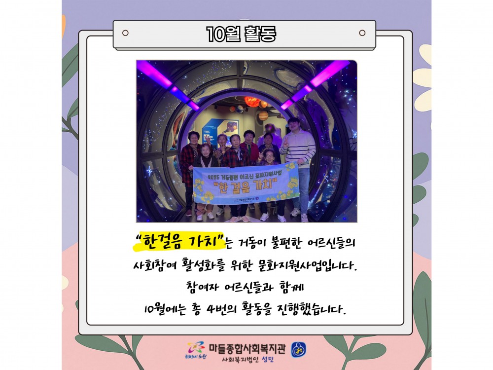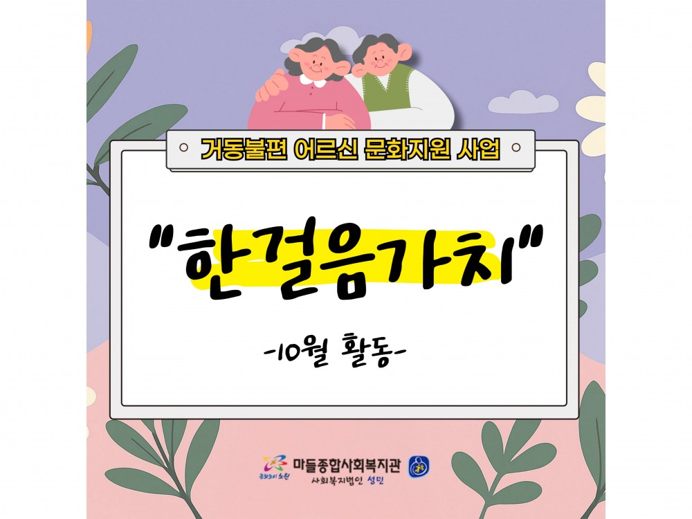 거동불편어르신 문화지원사업 '한걸음가치' 10월 활동 페이지 정보 작성자 서비스1팀 작성일25-10-30 16:47 조회536회 댓글0건 관련링크 이전글 다음글 목록 본문 #단풍 #추석#명절* 이 디자인은 미리캔버스에서 작업되었습니다.(https://www.miricanvas.com) 댓글목록 등록된 댓글이 없습니다. 이전글 다음글 목록