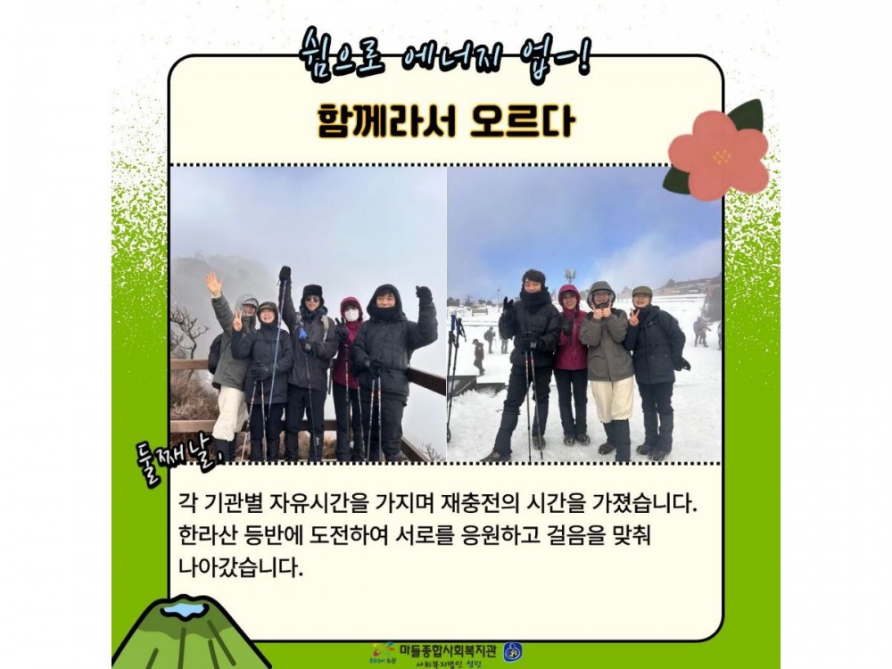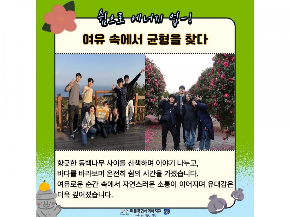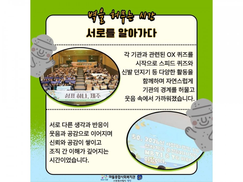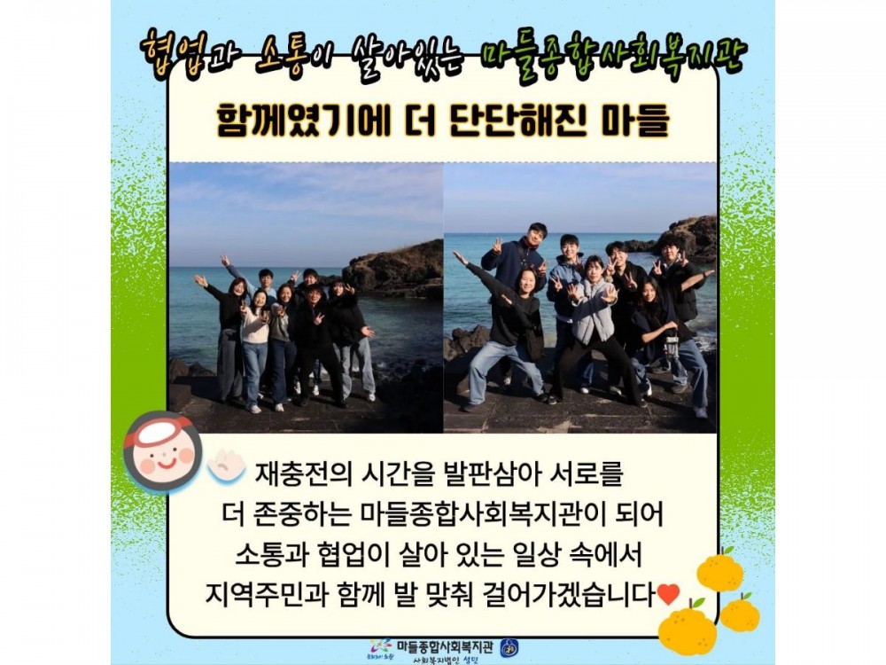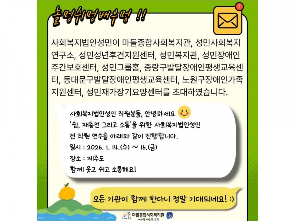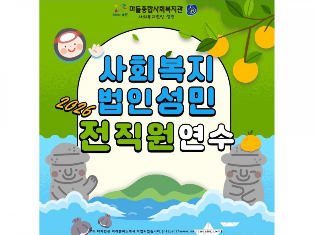 2026년 사회복지법인성민 전직원 연수 페이지 정보 작성자 경영지원팀 작성일26-01-20 23:17 조회92회 댓글0건 관련링크 이전글 다음글 목록 본문 * 이 디자인은 미리캔버스에서 작업되었습니다.(https://www.miricanvas.com)* 글꼴 출처 : https://bit.ly/4aRZ60P 댓글목록 등록된 댓글이 없습니다. 이전글 다음글 목록