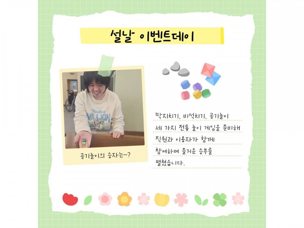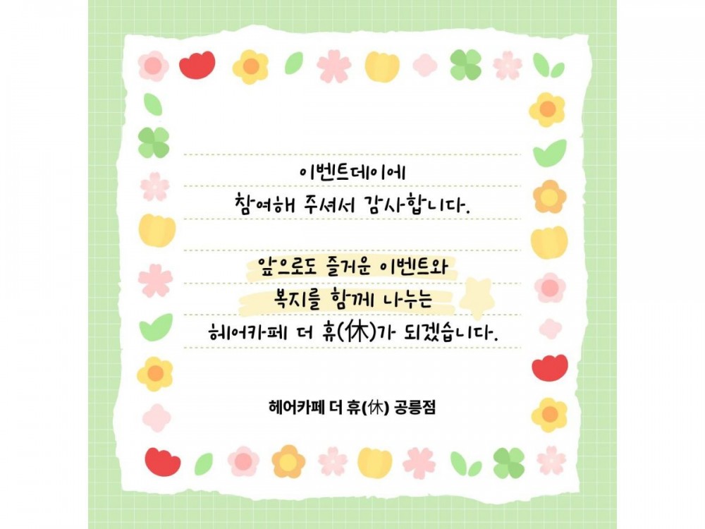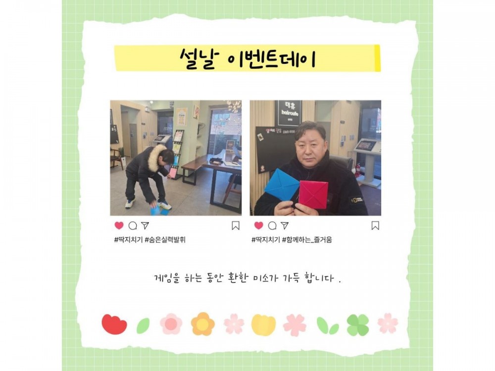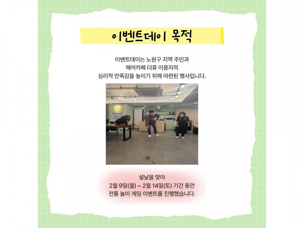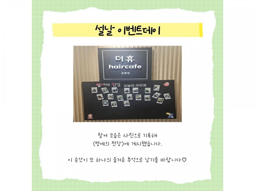 장애인친화미용실(공릉점) 설날 이벤트데이 페이지 정보 작성자 시설운영팀 작성일26-02-19 22:02 조회367회 댓글0건 관련링크 이전글 다음글 목록 본문 댓글목록 등록된 댓글이 없습니다. 이전글 다음글 목록